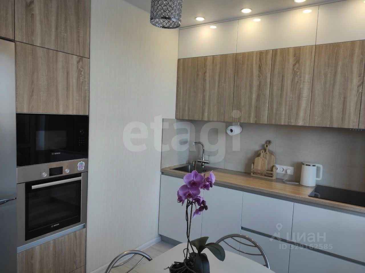 диван в кухне-гостинной, кухонный гарнитур с качественной встроенной техникой Bosch (индукционная варочная панель, духовка, посудомоечная машина, микроволновка),