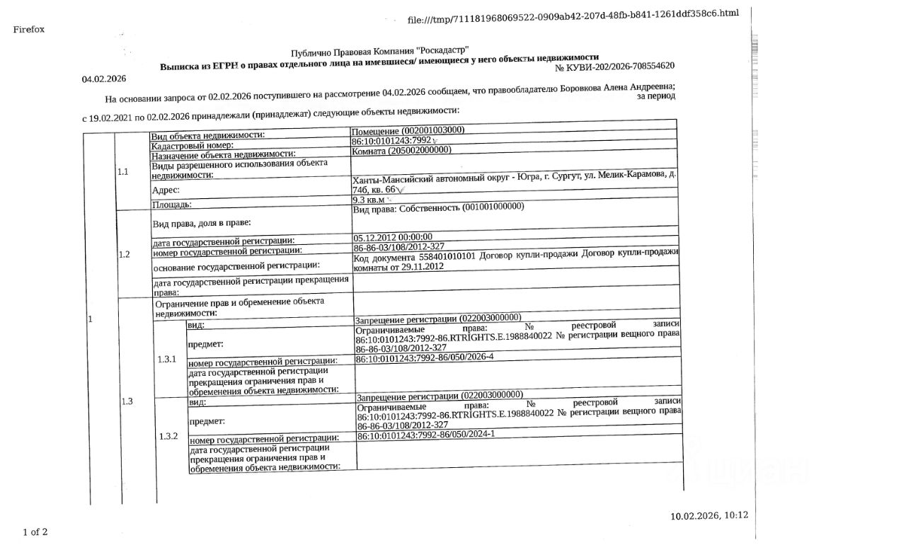Должник: Боровкова А.А., собственник: Боровкова А.А. Лот: Жилое помещение (комната), площадь 9,3 кв.м., кадастровый номер: 86:10:0101243:7992, г. Сургут, ул. Мелик-Карамова, д. 74б, кв. 66 (задолженность за кап. ремонт на 24.06.2025 - 19 т.р.), н/ц: 1080300 р., з-к: 1080 р., код: 0014, рег. 26-108;