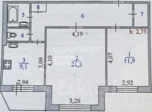 Площадь: 61.6 м² (просторная кухня 9.1 м², изолированные комнаты).