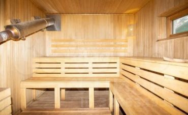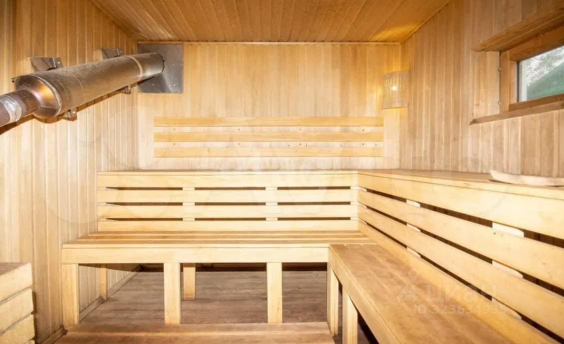 Баня 6х6 в два этажа: на первом — предбанник, ванная, сауна; на втором — гостевая комната.Два утепленных гаража 6х4, обшиты, установлено освещение.Между домом и баней — крытый переход.
