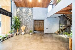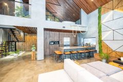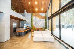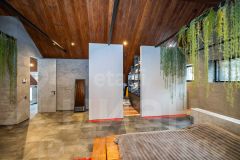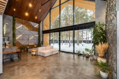 Первый этаж: холл, 2 гардеробные, гостиная с панорамным окном 8/8,5 метров, раздвижной портал 6/3,5 метра, столовая, кухня, терраса. 2 детских комнаты спальни, гостевой санузел, технические помещения, кладовая, гараж на 2 машины. В гостиной зоне кинотеатр, размер полотна 3,5 на 3 метра.