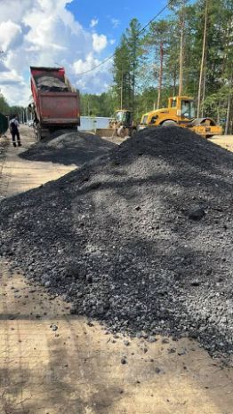 Дорога к участку полностью отсыпана асфальтной крошкой и укатана вибро-катком.
