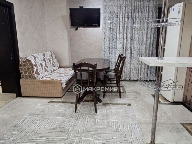 Квартира-студия, с дополнительной комнаткой, в которой расположен шкаф и холодильник, а так же вешалка и большое зеркало. В квартире есть двуспальный диван, кухонный гарнитур и обеденная зона. Холодильник, стиральная машина, электроплита, микроволновка и электрочайник, посуда. Проведён интернет. При необходимости можно рассмотреть дополнительную мебель, телевизор. Квартира чистая, есть большая лоджия.